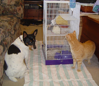 Well folks, day before yesterday was the big day! I received my own rat. I had just walked outside to take out the trash, when I happened to glance in the direction of the driveway, and imagine my joy when I discovered a strange car was parked there. I was even more overjoyed when, upon further examination, there next to the car was a girl with a large wire cage in her hands. After I had thrown out the trash, and pieced together the clues, I deducted that this, was in fact, Katie Donovan and she had come to give me her rat! (Of course I knew all this immediately! Mrs. Donovan came out and we went over a few guidelines, and instructions for care. After they left, I made haste to bring the cage and it’s occupant up to my room, where I had prepared a place for him to stay. Except of course, Michelle and I found out that Ratatouille, was a she. I decided to name her first Rheumy, then Lint, and finally Lucy. She is absolutely adorably! Even though she is not as cute as hamsters, you can do a lot more with her. She found and old cloth dog house, and kept crawling into it. This led me to the decision to put the dog house into her cage for the night. Next morning my mom discovered she had torn through it and removed the foam padding inside! So much for the cloth dog house. We took her cage downstairs, and let the other pets get a look at her. Beamer and Squiggy were fascinated, so much that Beamer didn’t even go into the kitchen to finish his breakfast. Unthinkable! Jinx didn’t really think much of her, and ran off instead to fight with Squiggy. Oh, our funny pets. I think we are going to really enjoy my little rat. She even has a tiny harness and leash! But the best part is, she doesn’t really mind being held, so long as you support her and are gentle. I am thrilled at the thought of finally owning my own rodent, something I have wanted long before I became serious about my campaign. Once again, to all you rat haters out there, even my mom likes Lucy. That is saying A LOT. So you all need to come over and see how cute and sweet and funny Lucy is. That’s all for now!!! Tootles!